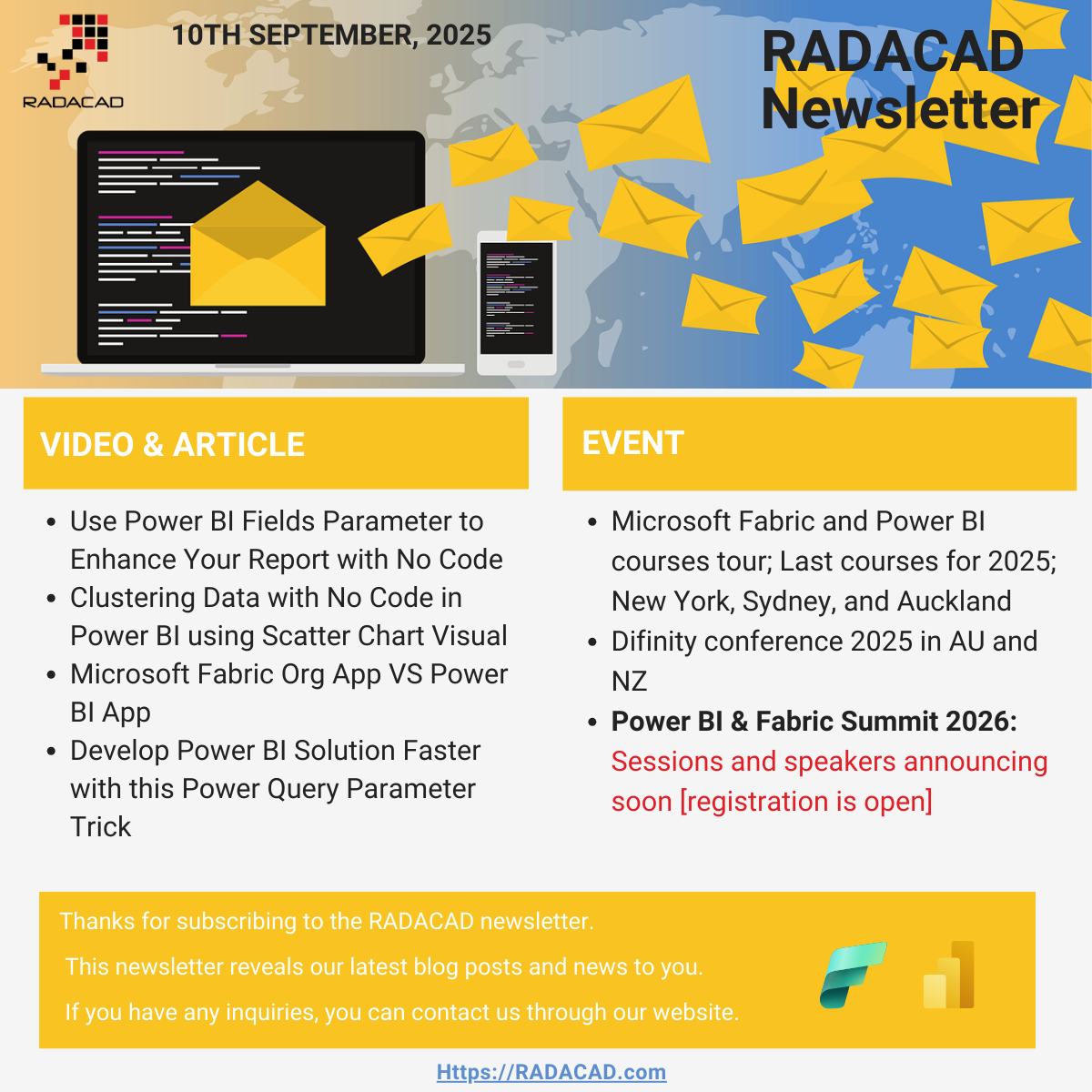 RADACAD courses in North America, Europe, Australia, and New Zealand. Last year, the tour was in 17 cities, and we got fantastic feedback from attendees. This year's tour includes Power BI and Fabric training, and we look forward to seeing you there.