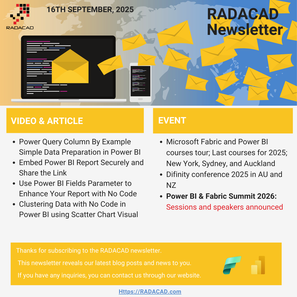Leila Etaati is a name that RADACAD started, grew, and matured with it. She was the heart and brain of RADACAD. It is with great sadness that she passed away on the morning of 31st of December 2023 after 11 months of nonstop fight with progressive head and neck cancer. Leila was co-founder and co-director of RADACAD, Power BI & Fabric Summit, Difinity conference, Data Insight Summit, SQL Saturday Auckland, Power BI and Analytics user group in Auckland, and Global AI BootCamp in Auckland.